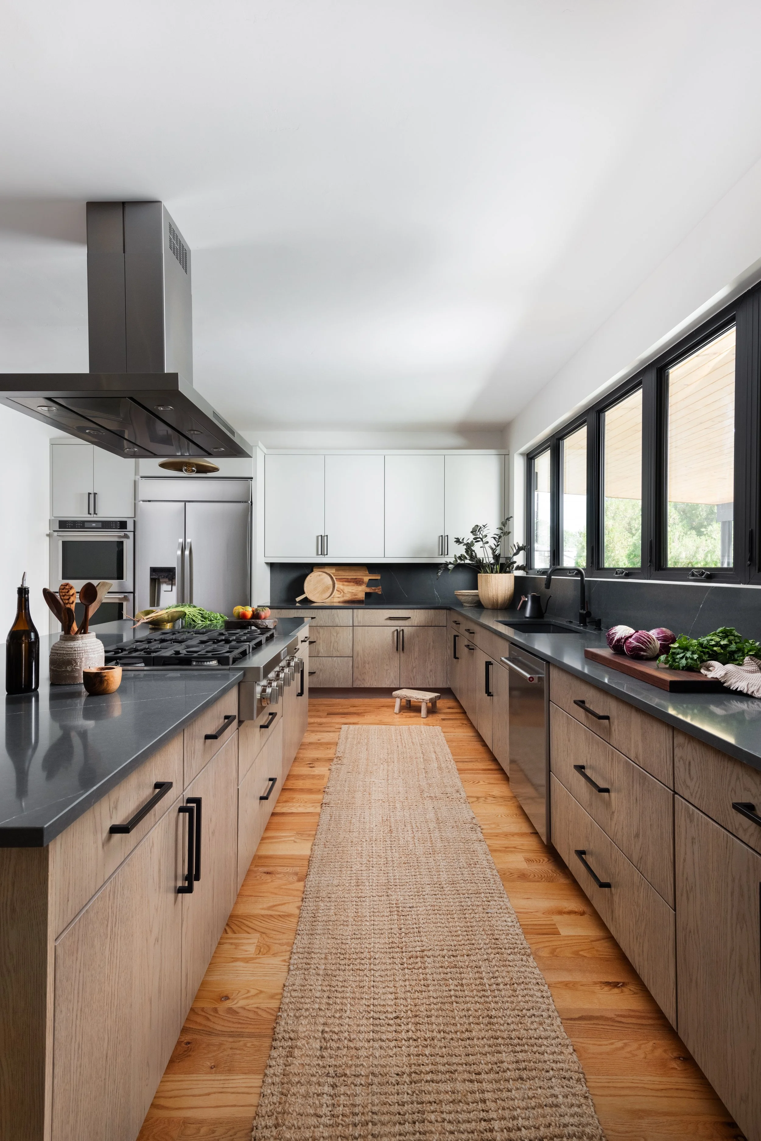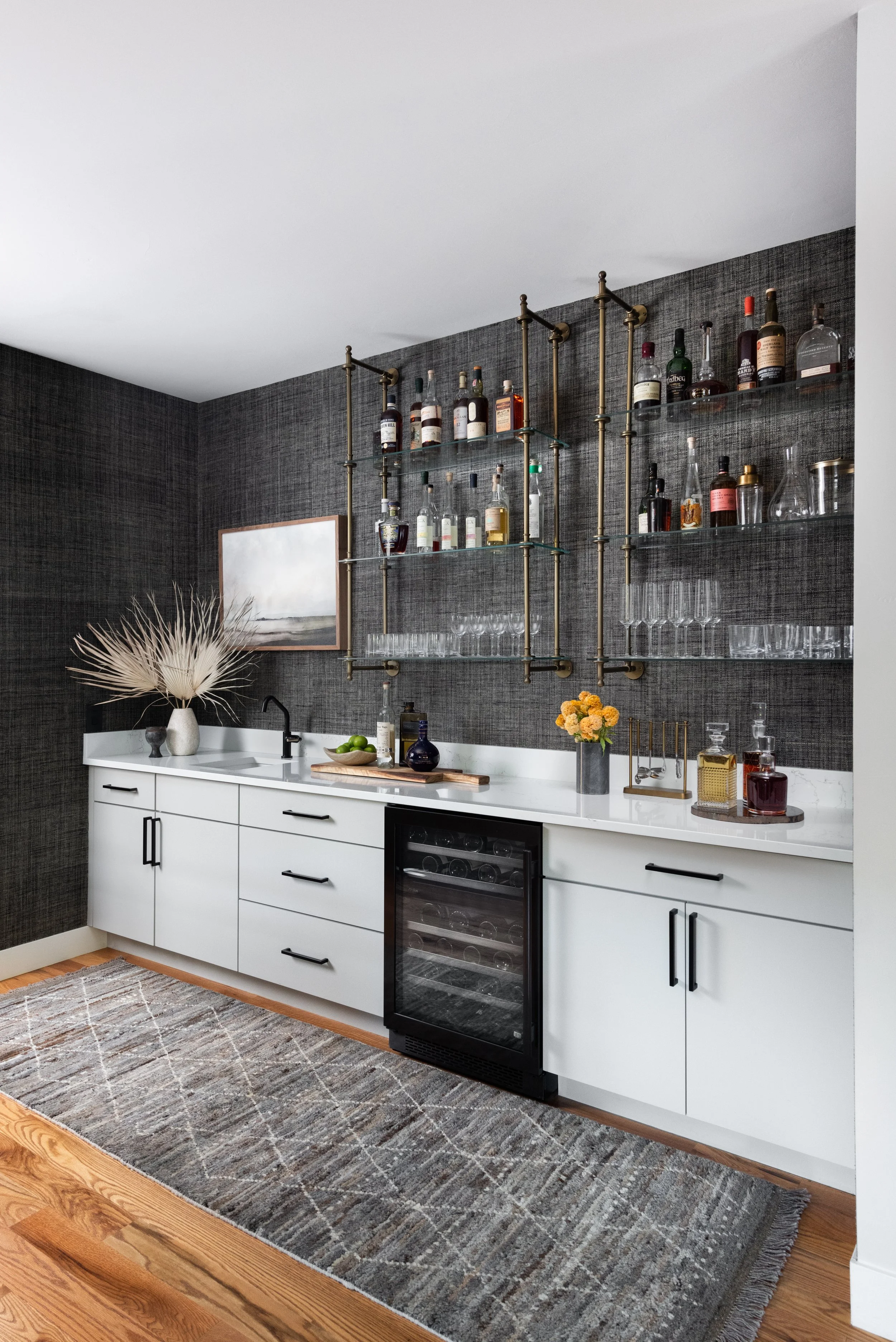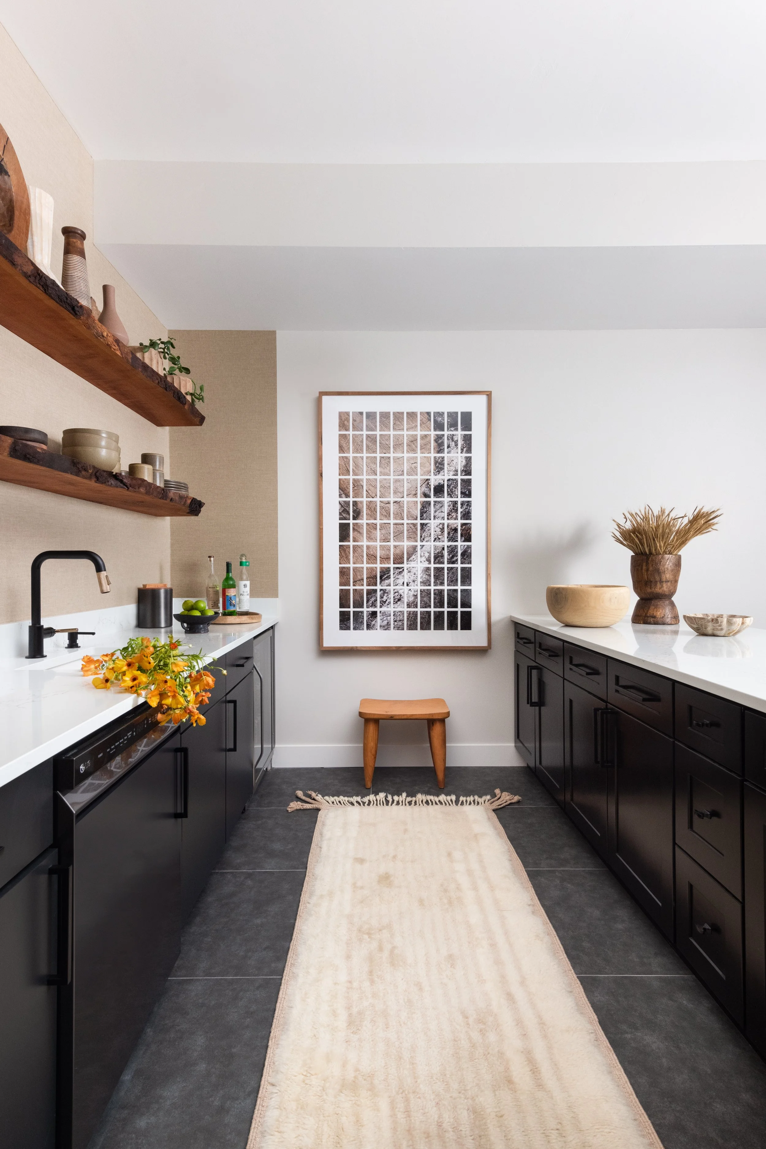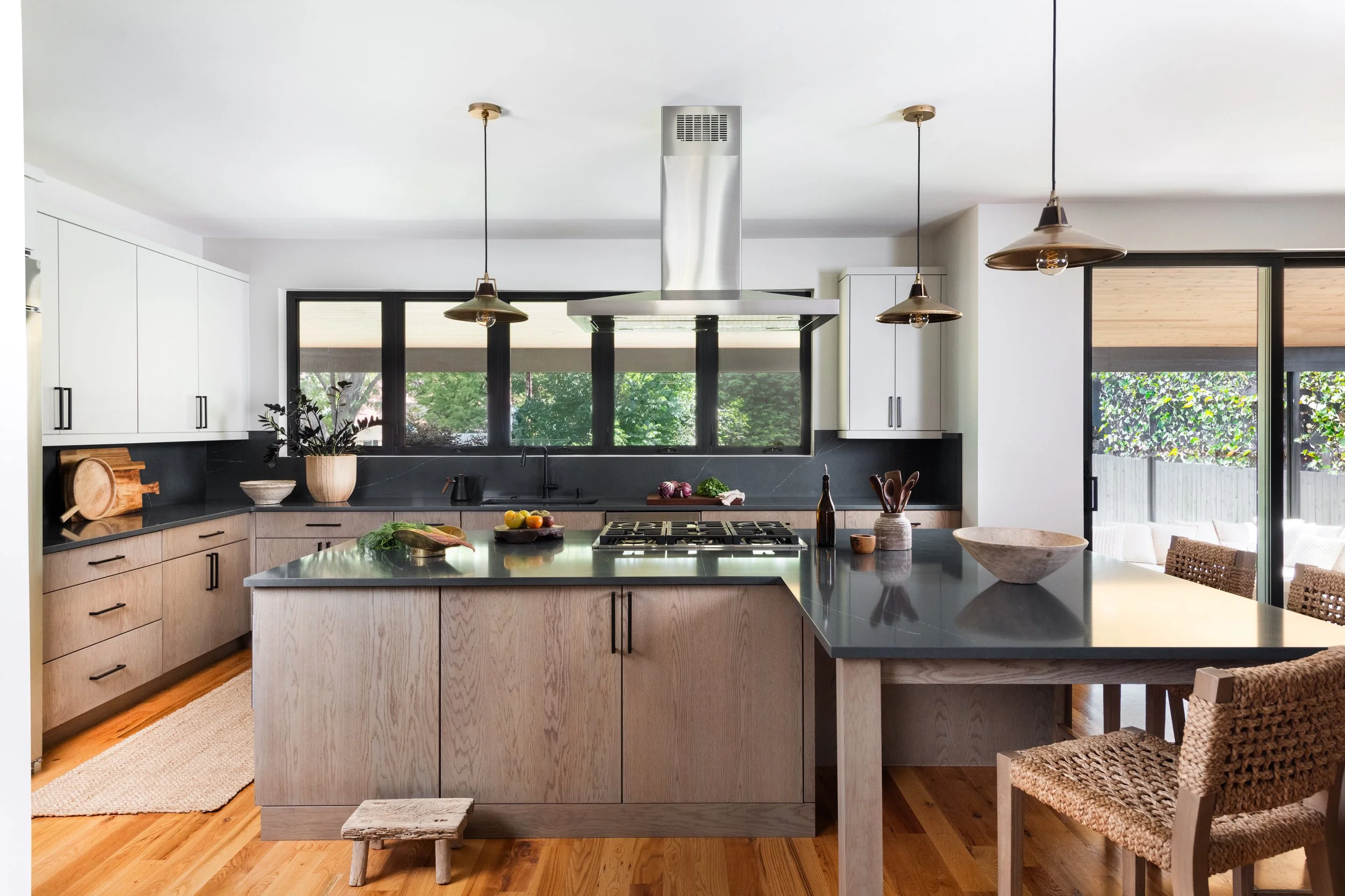 Kitchen design with white cabinets, brass hardware and marble look porcelain countertops