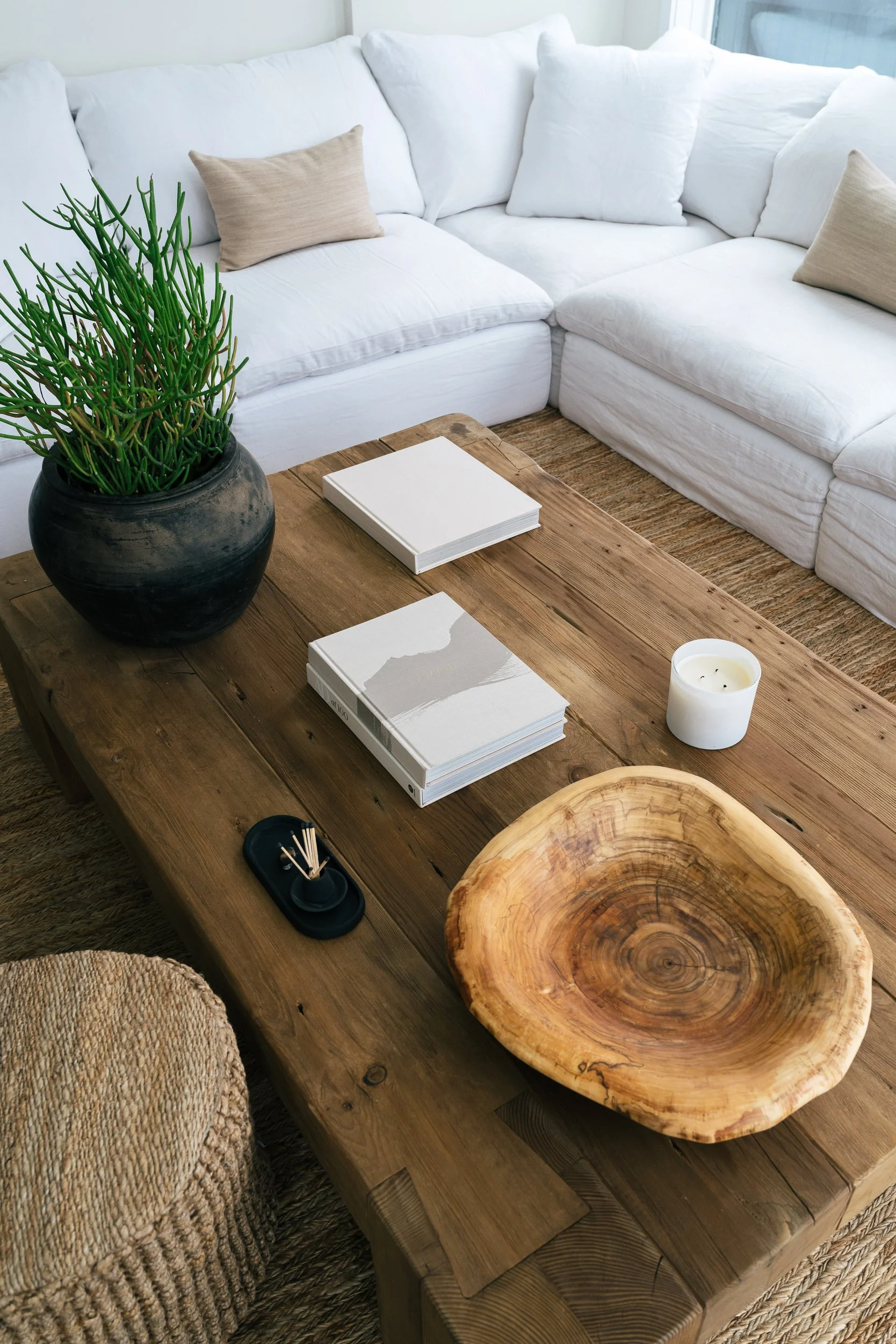 Living room design with white linen sofa, wood coffee table, jute poufs and natural rug