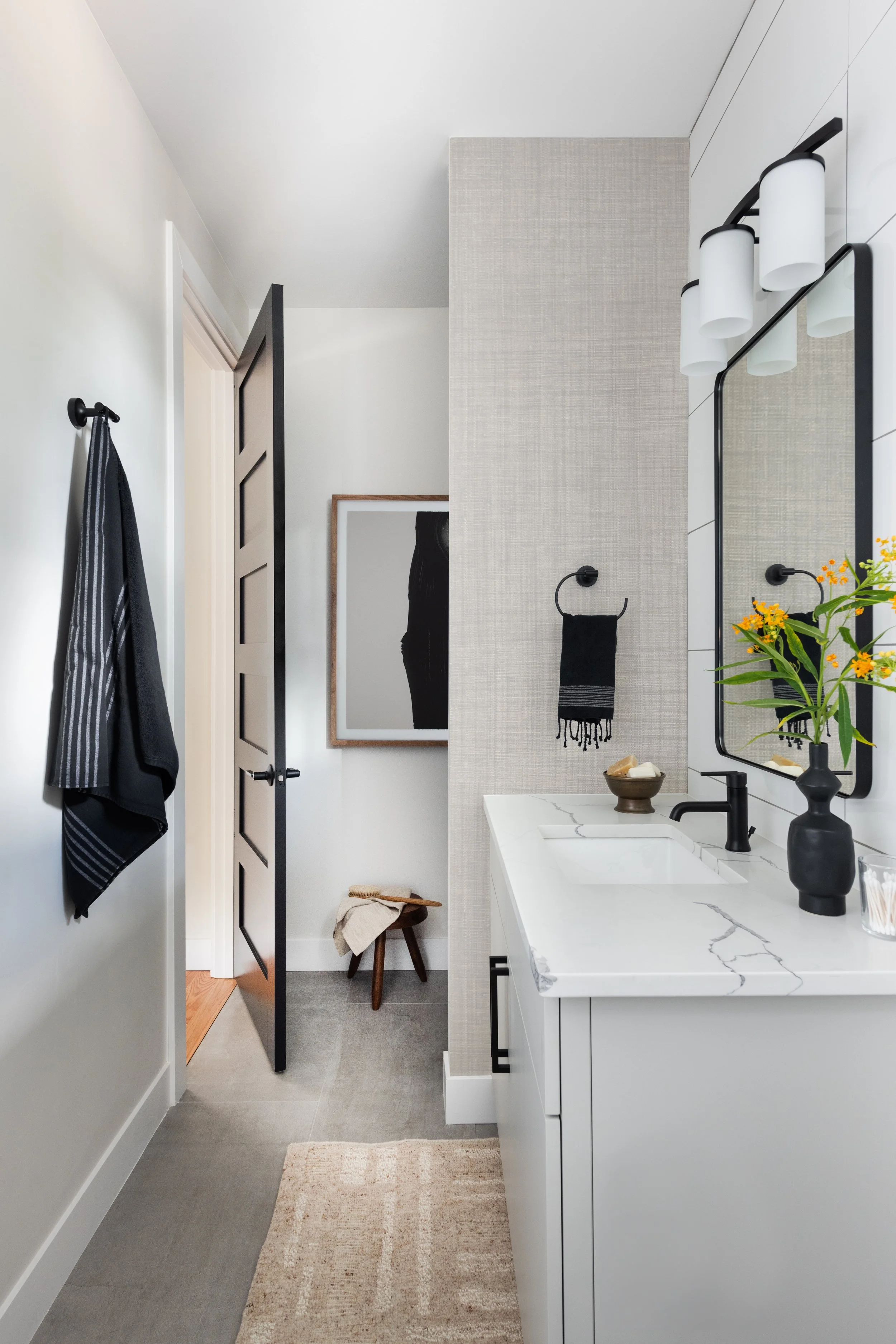 Bathroom design with white cabinets, brass hardware and vintage buddha head