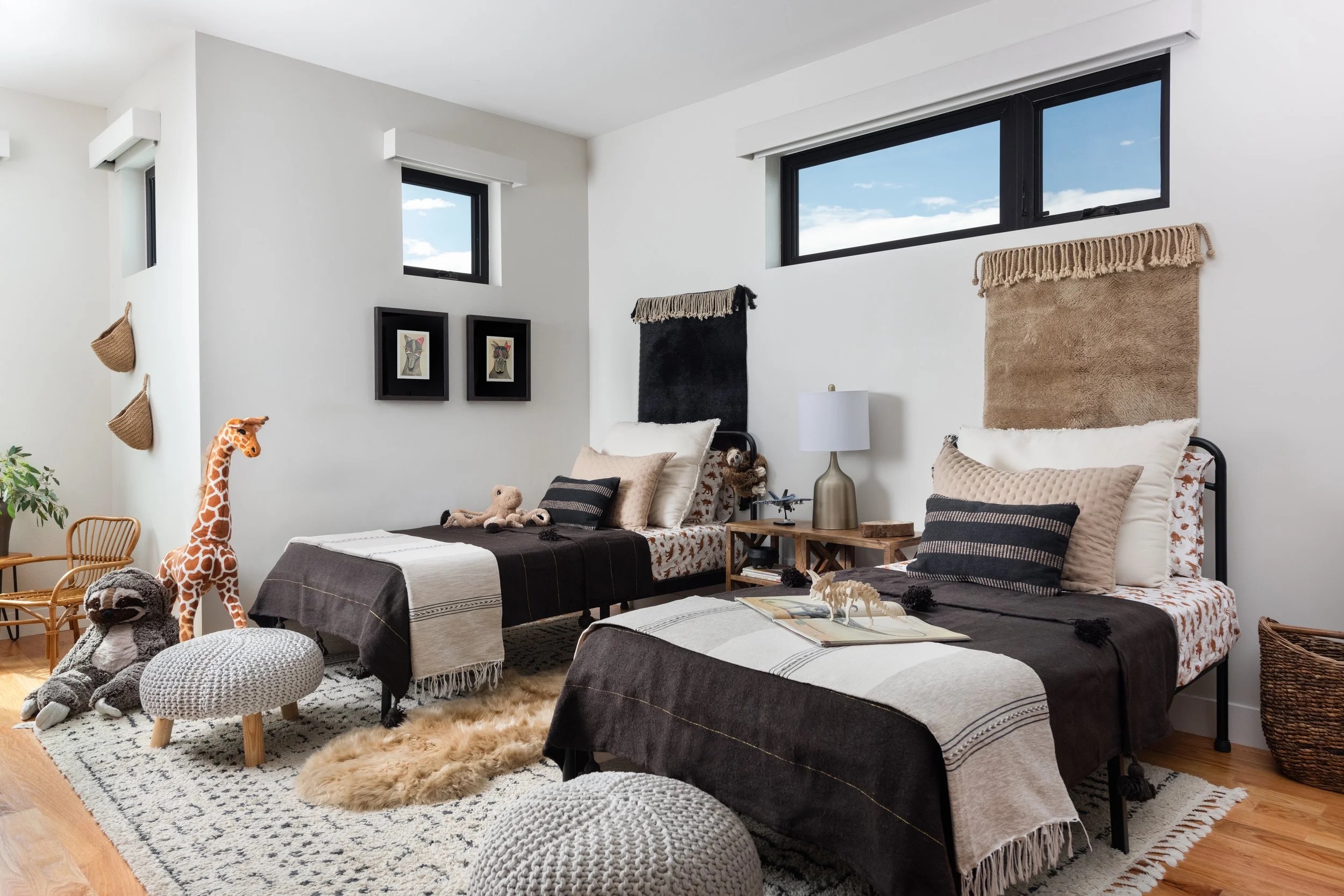 Bedroom sitting area with Turkish throw blanket, linen sofa and leather stool