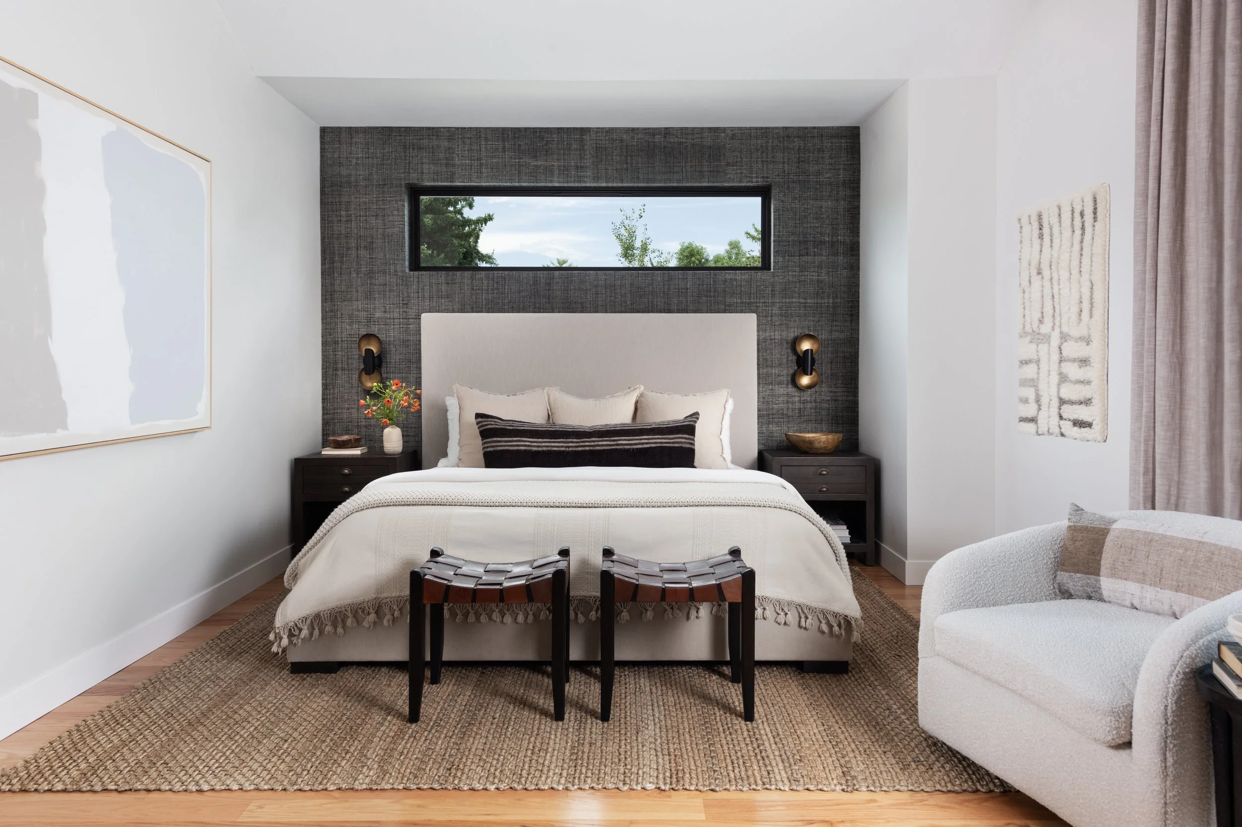 Bedroom design with sitting area, leather headboard, wood nightstand and marble lamp