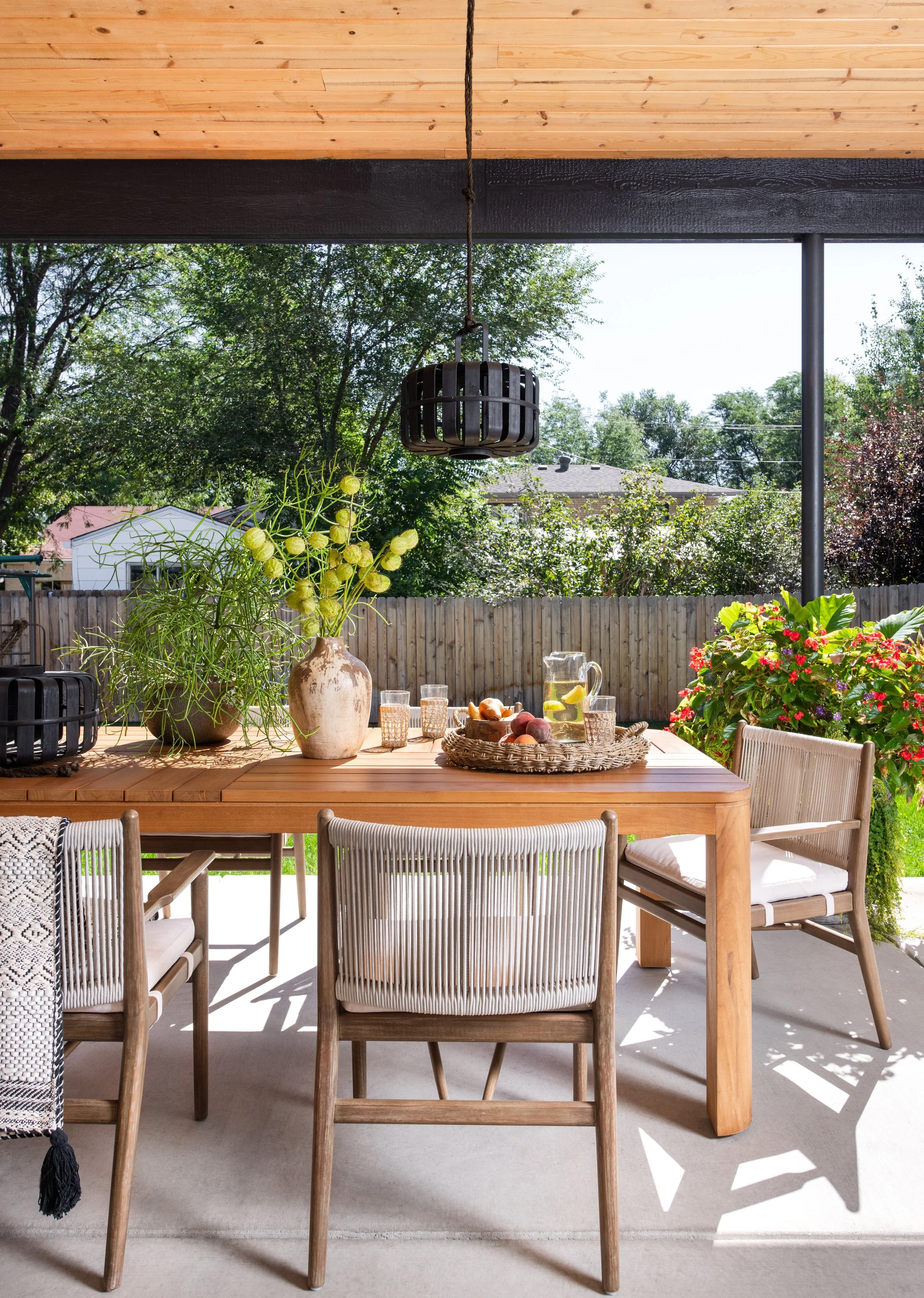 Sitting area with vintage African wood table, black hide chair and Mexican throw blanket