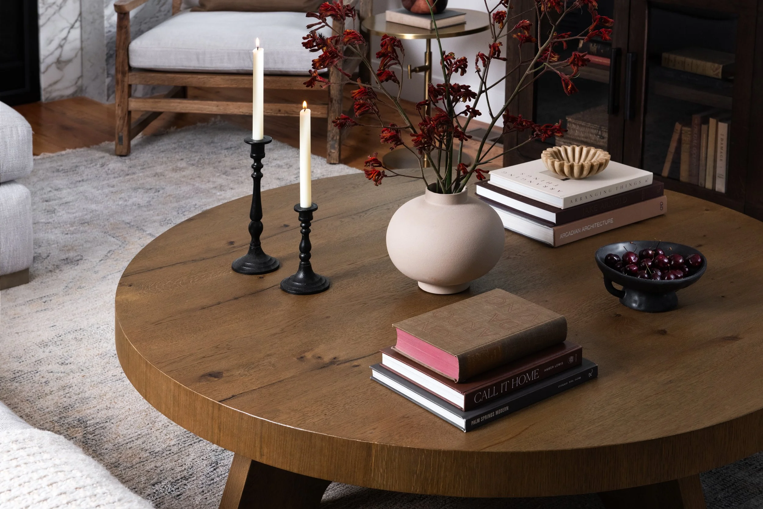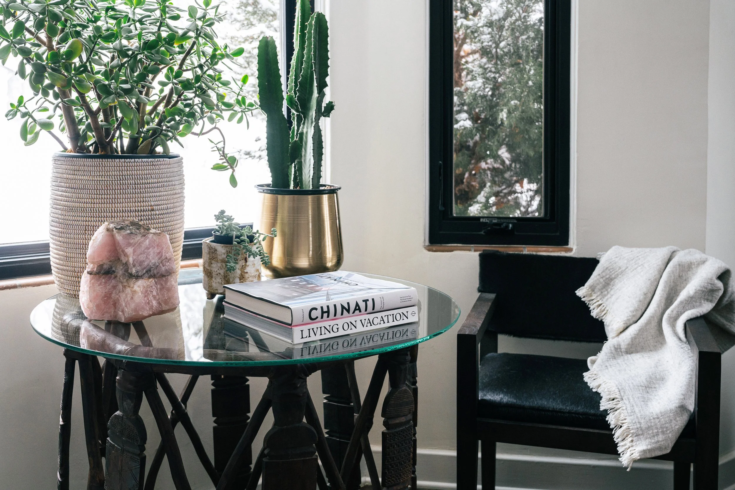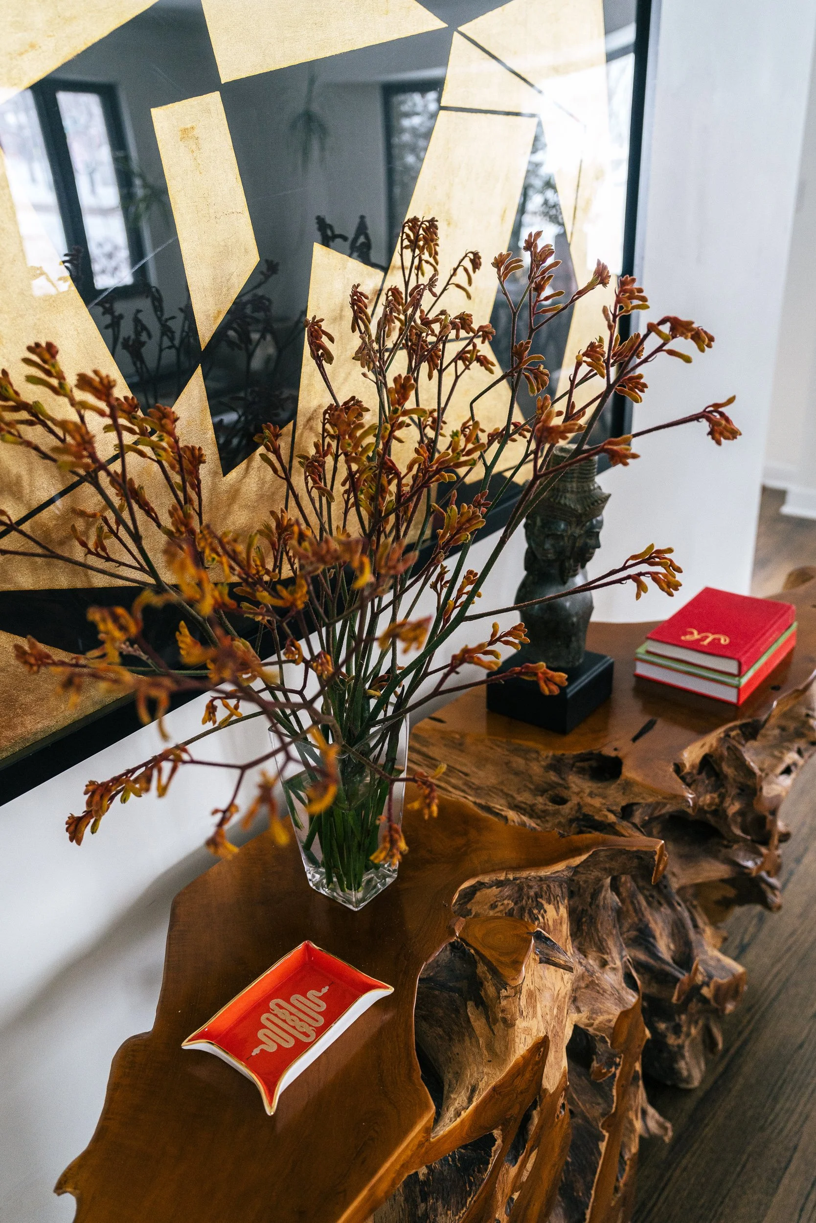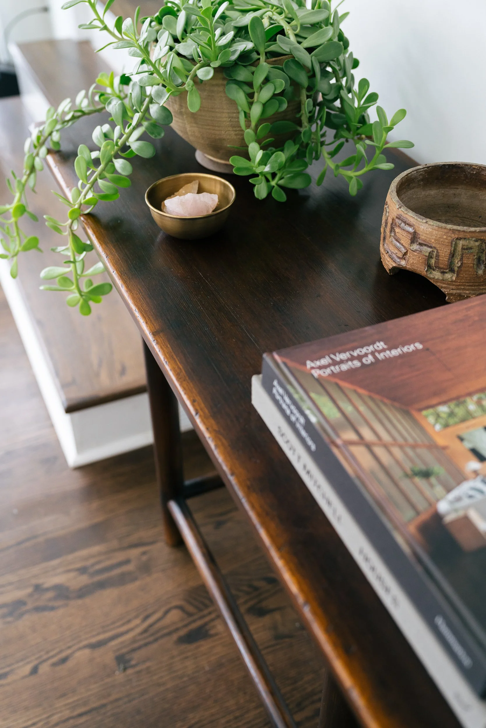 Console table styling with rose quartz, vintage ceramic bowl, books and greenery
